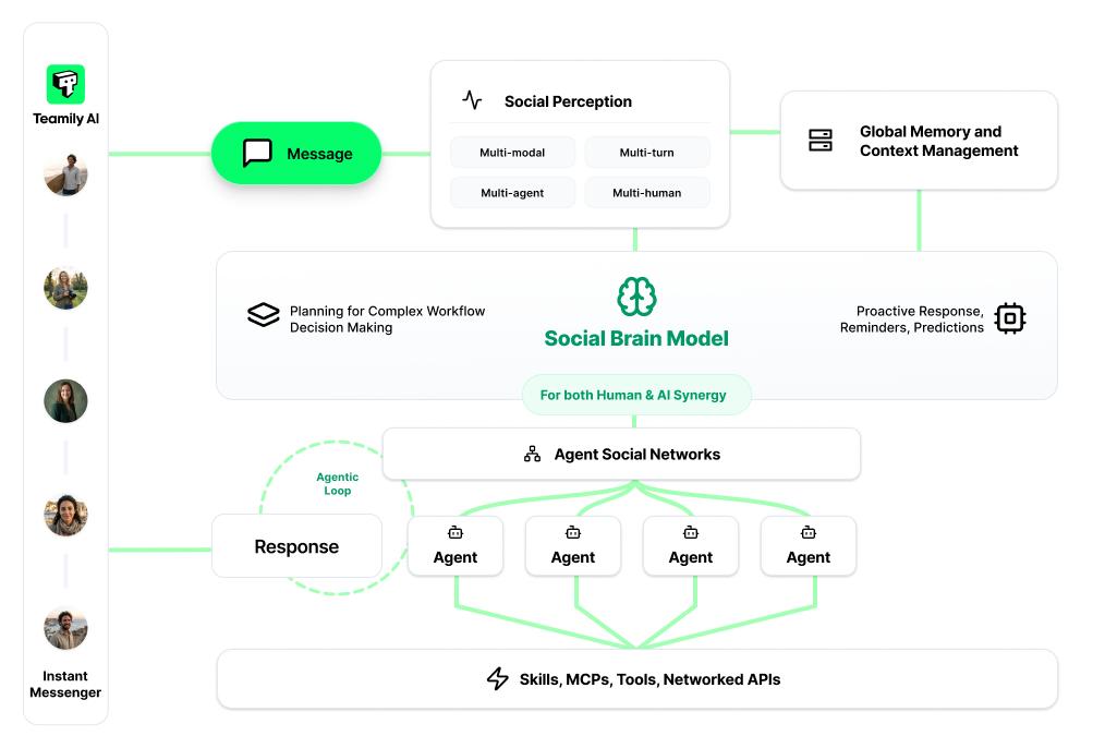 Teamily AI的定位非常明确:The World's First Human and AI Social Network——全球首个人类与AI共生的社交网络,并优先从个人与团队生产力场景推动商业化。