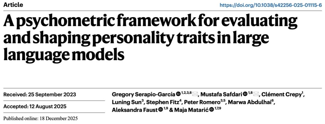 另一项来自剑桥大学的研究A Psychometric Framework for Evaluating and Shaping Personality Traits in Large Language Models (《 用于评估与塑造大语言模型人格特质的心理测量学框架》)采取了更为清醒的操作主义路径。