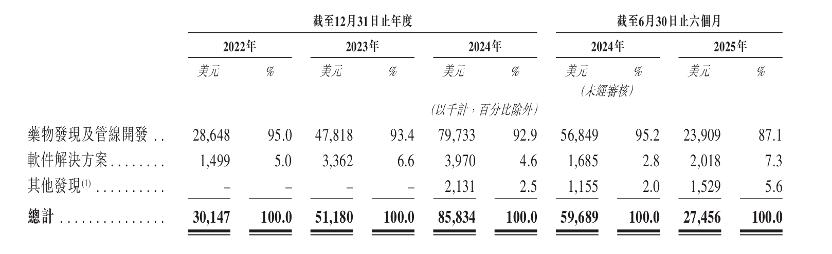 口碑的另一面必然是真金白银的营收。从公开数据来看,英矽智能的软件平台收入从2022年起一路走高,到2024年的复合年增长率达到62.7%,仅2025年上半年,确认收入已经超过2022年的1.5倍。