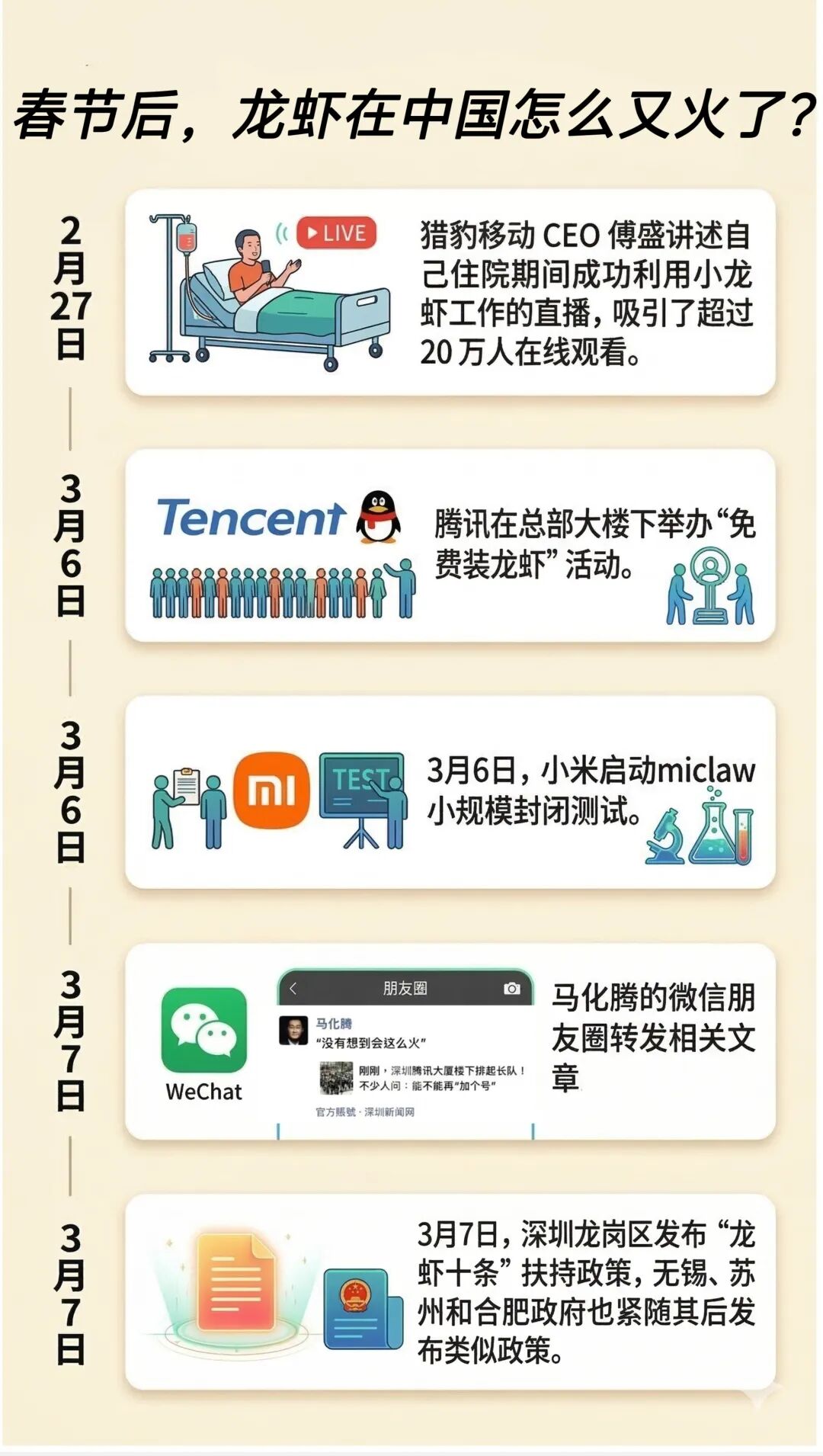 这是最能嗅到机会的一群人,而龙虾如今的火爆,呈现出强烈的“风口掘金”特色——技术+营销+暴富神话。当中有几个关键节点: