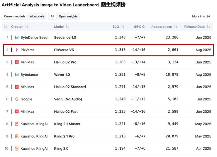 在今年 2 月底的最新榜单上,最新版本的 PixVerse V5.6 在图生视频领域与文本生视频领域上继续名列前两位,是榜单中表现最为突出的中国模型之一。