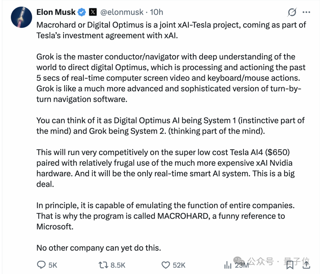 毕竟,老马前不久刚披露了“巨硬 / 数字擎天柱”的最新动态。