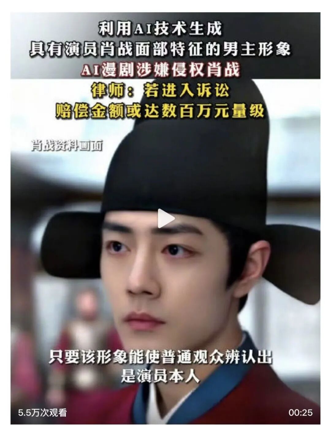 就在这种焦虑情绪蔓延之际,#AI短剧肖战#的热搜更是将AI短剧推向了风口浪尖。据报道,某短视频平台涌现出大量以肖战形象为主角的AI生成短剧。虽然部分视频标注了“AI生成”或使用了滤镜,但其模仿程度之高,依然引发了粉丝和业内人士的广泛争议。这种未经授权使用真人形象的行为,到底是技术创新,还是赤裸裸的侵权?平台又该如何监管这种游走在法律边缘的“山寨”内容?