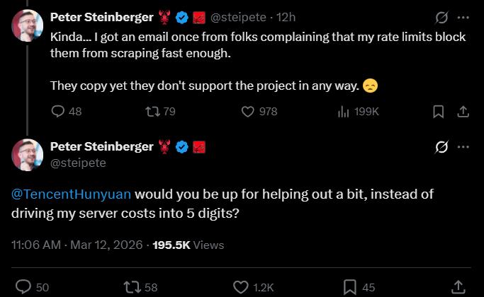 于是,3 月 9 日,腾讯决定亲自下场推出,将 OpenClaw 套壳封装后推出腾讯版龙虾 QClaw 并于次日公测,其微信直连的创新交互方式引来行业广泛关注。QClaw 测试火热,一度将 OpenClaw 的服务器成本顶到“五位数”,引发原作者 Steinberger 的强烈不满。
