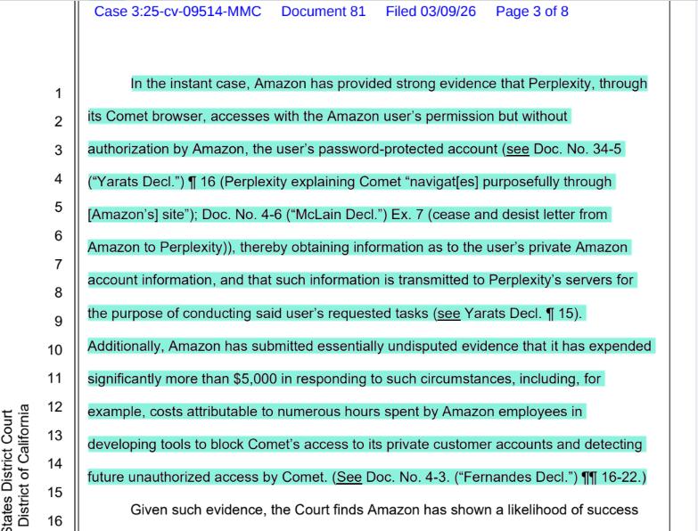2025年11月4日亚马逊提起诉讼,就自动购物智能体问题对Perplexity提起诉讼。法院于2026年3月9日批准了亚马逊的初步禁令动议,因为法官在四个审查要件上均支持了亚马逊的主张:
