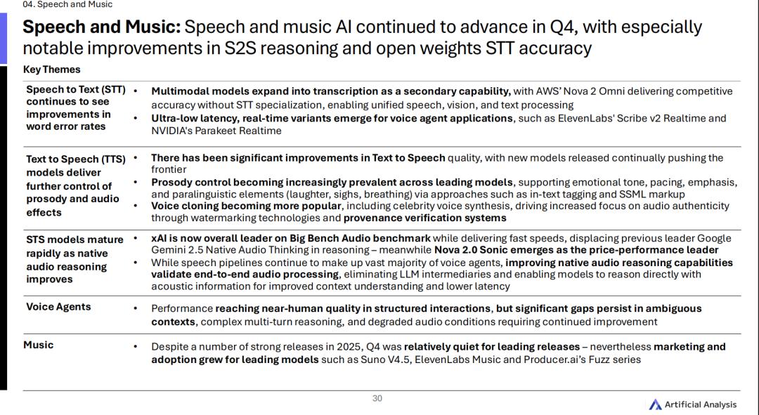 四季度,xAI凭借极快的响应速度和恐怖的原生听觉理解力,强势掀翻了前任霸主谷歌Gemini2.5NativeAudioThinking,登顶了BigBenchAudio评测榜首;而亚马逊的Nova2.0Sonic则极其精准地踩中了市场的痛点,加冕性价比之王。