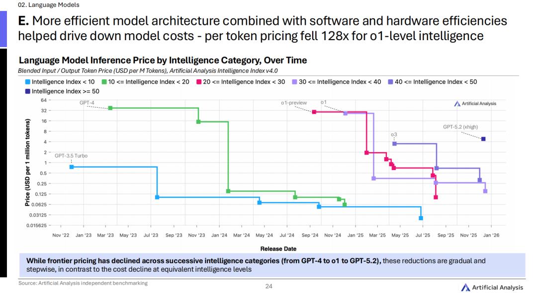 由于模型体积的不断缩小、软硬件效率的极致提升,我们在2025年初还要顶礼膜拜的o1级别智力,其每Token的使用成本,在短短一年内发生了自由落体般的坠落,整整降了128倍!