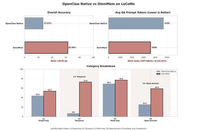 我们先做了一个AB测试:把OpenClaw原生的Memory底座解耦出来,单独换上我们的OmniMemory引擎,在同一数据集上对比。结果显示,我们没想到的是原版准确率只有25%,接入我们之后提升到60%,提升了35个百分点。