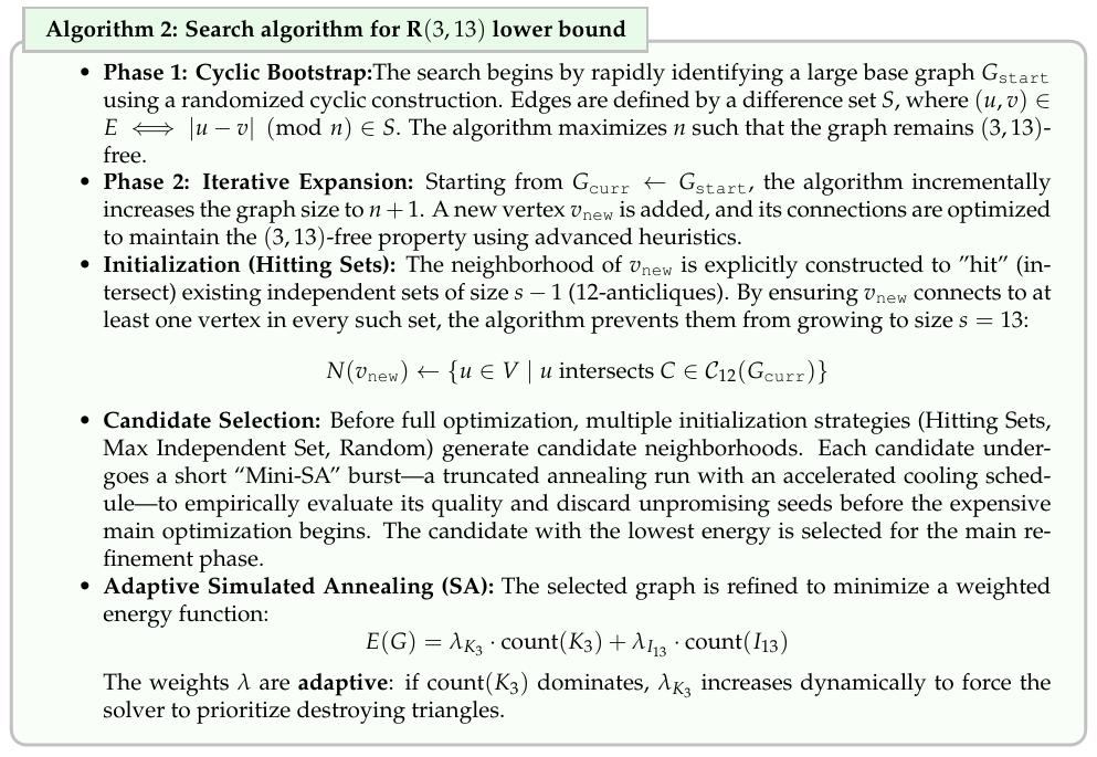 它目前只能搞定「下界」,也就是构造反例。而拉姆齐数的「上界」需要证明某个尺寸以上的图不可能满足约束,不能靠找一个例子来解决。