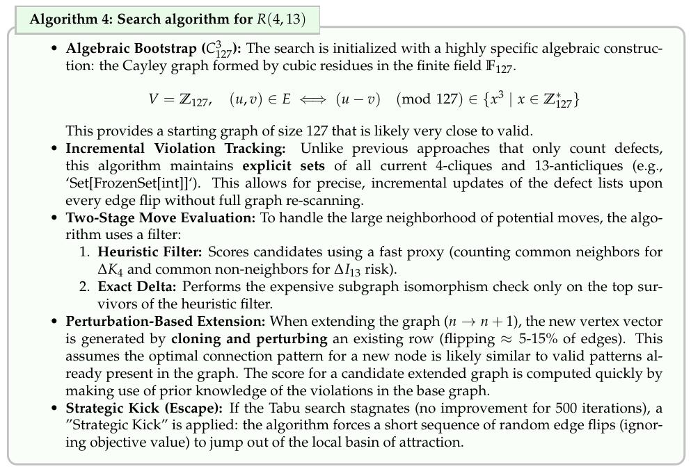在大图上精确计算所有4-团和13-独立集非常耗时,AlphaEvolve的算法会用位运算加速、启发式过滤、增量更新等技巧来大幅降低计算开销。