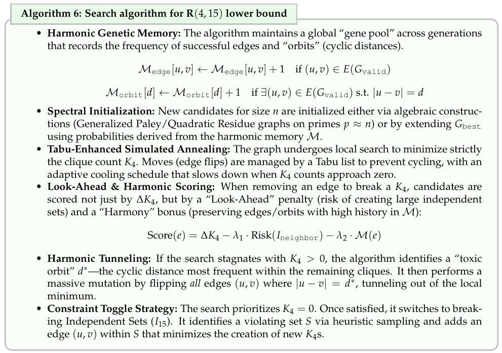 R(4,15):和声记忆 + 谱初始化 + 有毒轨道隧穿。