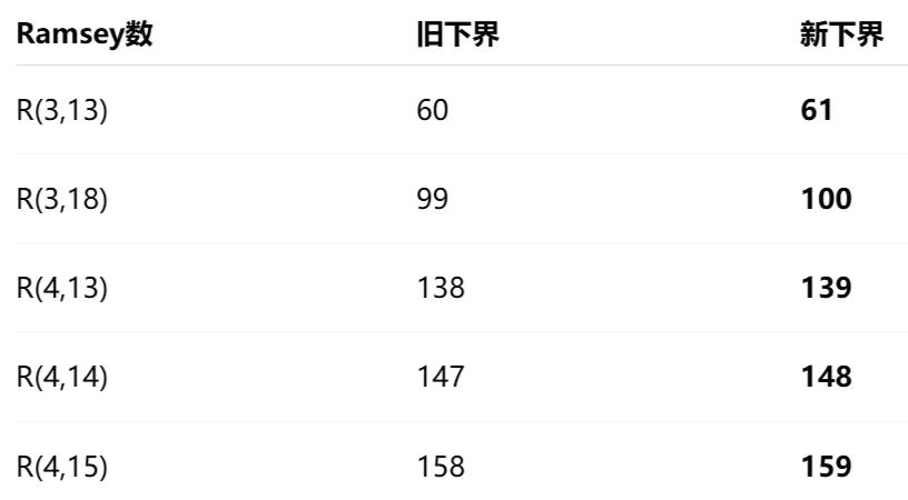 除了这5个新纪录,它还匹配了所有已知精确值的拉姆齐数下界,以及大量其他值的当前最佳下界,总共覆盖28个R(r,s)。