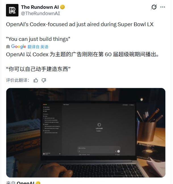 OpenAI也在加大投入。今年的超级碗广告,他们投放的是Codex,而不是ChatGPT。