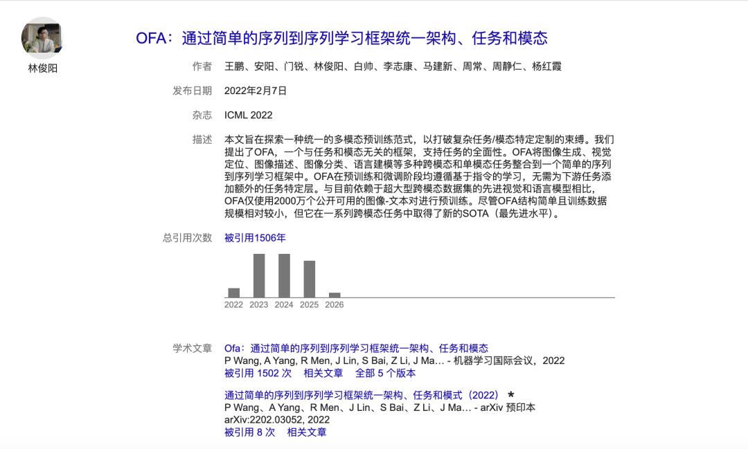 从林俊旸的学术轨迹中,也能看到一种非常语言学的研究风格。他主导的 OFA(One For All),2022 年发表于机器学习领域的顶级会议 ICML,至今被引用近 1500 次。这个工作的核心思路不是为每个任务搭专用方案,而是用一个足够通用的序列到序列框架,把图像生成、视觉定位、图像描述、文本分类等跨模态任务统一起来。