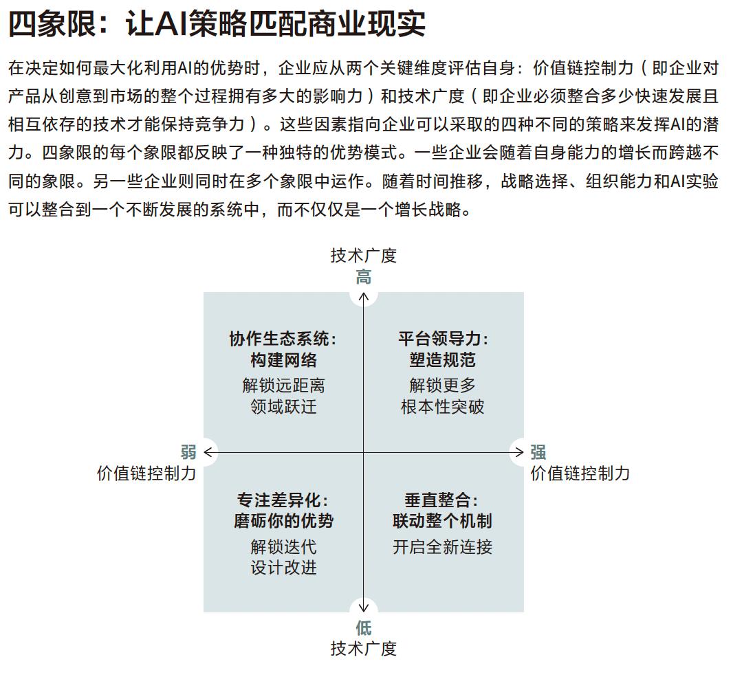 本文将提供一个实用的框架,旨在帮助企业提高AI投资回报率。基于对跨行业企业(包括消费品和先进制造业)的研究和经验,我们总结了影响AI成功的两个关键维度:价值链控制力和技术广度。这些因素界定了各种可能性,并指明企业可以采取四种截然不同的方法来发挥AI的潜力:聚焦差异化、垂直整合、协作生态系统和平台领导力。每种方法都伴随着各自的风险、要求和突破性创新的潜力。但当某种方法与企业的实际情况相匹配,回报将是巨大的。