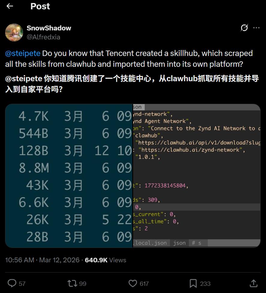 这位创始人的火气瞬间就被点燃了。因为就在不久前,他还收到过一封莫名其妙的邮件,对方居然抱怨他的速率限制,导致他们无法快速抓取数据。紧接着,他在X平台上公开向腾讯开炮,直言自己完全是在X上才得知SkillHub的存在。