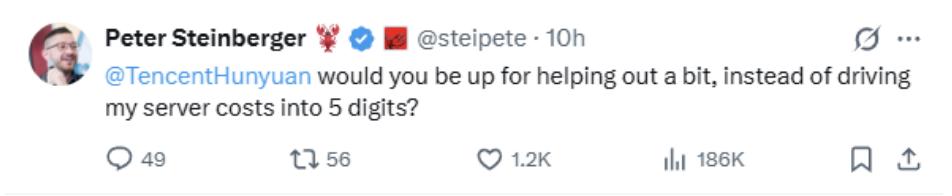 除此之外,Peter Steinberger还@腾讯混元表示:“愿意帮帮忙吗?而不是让我的服务器成本飙升到五位数?”