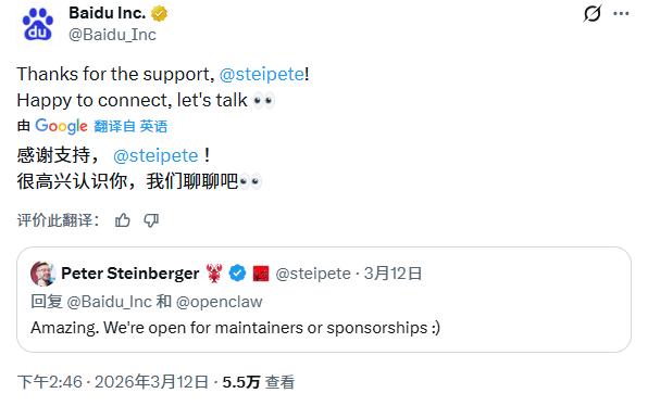 就在Peter Steinberger狂怼腾讯的同时,他对百度的态度却来了一百八十度的大转弯。百度不仅在线下搞起了“龙虾市场”帮人安装OpenClaw,还在X上和创始人公开“秀恩爱”。