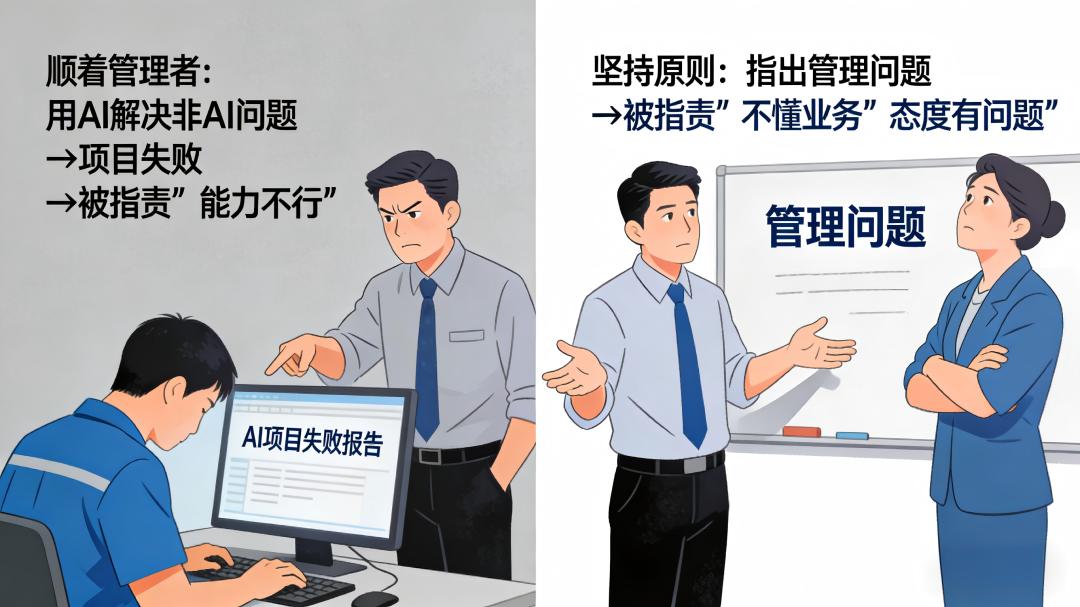 这是一种双重困境:如果技术人员顺着管理者的意思,用AI去解决一个本来不该由AI解决的问题,项目大概率会失败,然后被指责“能力不行”;如果技术人员坚持原则,指出管理问题才是根本,又可能被指责“不懂业务”“态度有问题”。