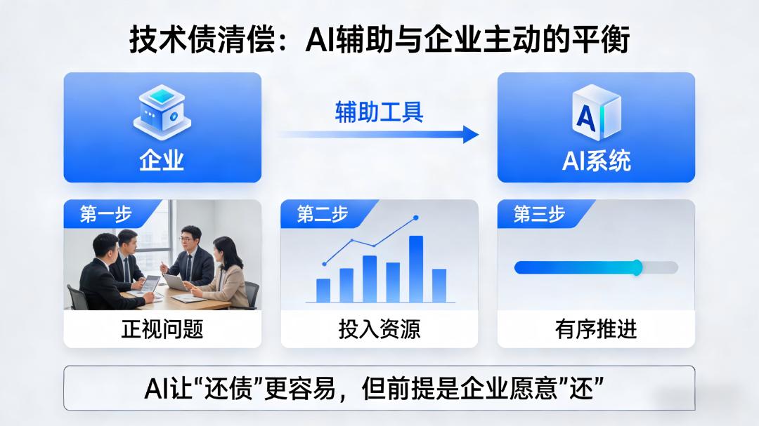 更重要的是,AI不能替企业做出“还债”的决定。那些指望“上一套AI系统就能自动清债”的企业,大概率会失望。技术债的清偿,依然需要企业正视问题、投入资源、有序推进。