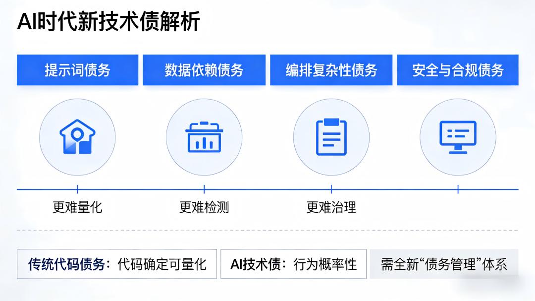 这些新型债务有一个共同特征:它们比传统代码债务更难量化、更难检测、更难治理。代码至少是确定的,而AI的行为带有概率性——这意味着我们需要一套全新的“债务管理”体系。