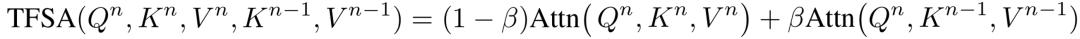 与KV-Fused SA直接在注意力计算前融合键值不同,TFSA 采用了一种后向的时序约束策略。在生成第帧时,TFSA 将当前帧和前一帧的键和值的注意力输出融合: