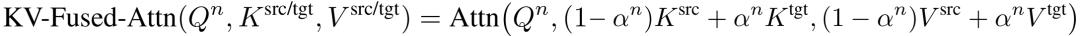 其中代表变形第帧的查询(Query),而和则是分别来自源物体和目标物体的键(Key)和值(Value),为控制变形进度的变形权重。在交叉注意力模块(Cross-Attention)中,键和值来自于引导生成的图像条件;在自注意力模块(Self-Attention)中,键和值则来自于隐特征本身。