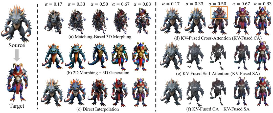 如图4最后一列所示,MCA 通过独立处理源特征和目标特征,保持了对语义一致区域的准确关注,从而避免了在 KV-Fused CA 中观察到的伪影。虽然 MCA 的改动看似只是调整了计算与融合的次序,但其核心价值在于:继承了原生注意力机制「精准聚焦」的特性,保证了条件特征的语义一致性,为高质量的三维跨类变形提供了一种简洁且高效的解法。