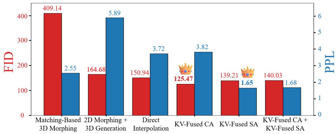 研究初期,作者尝试了最直接的融合方案:直接对源物体与目标物体的图像条件(Image Conditions)和初始噪声进行插值。观察图1-(c) 可知,该策略效果并不理想,图3中的定量指标FID [2](越低代表合理性越好)与PPL [3](越低代表平滑性越好)也印证了这一点。