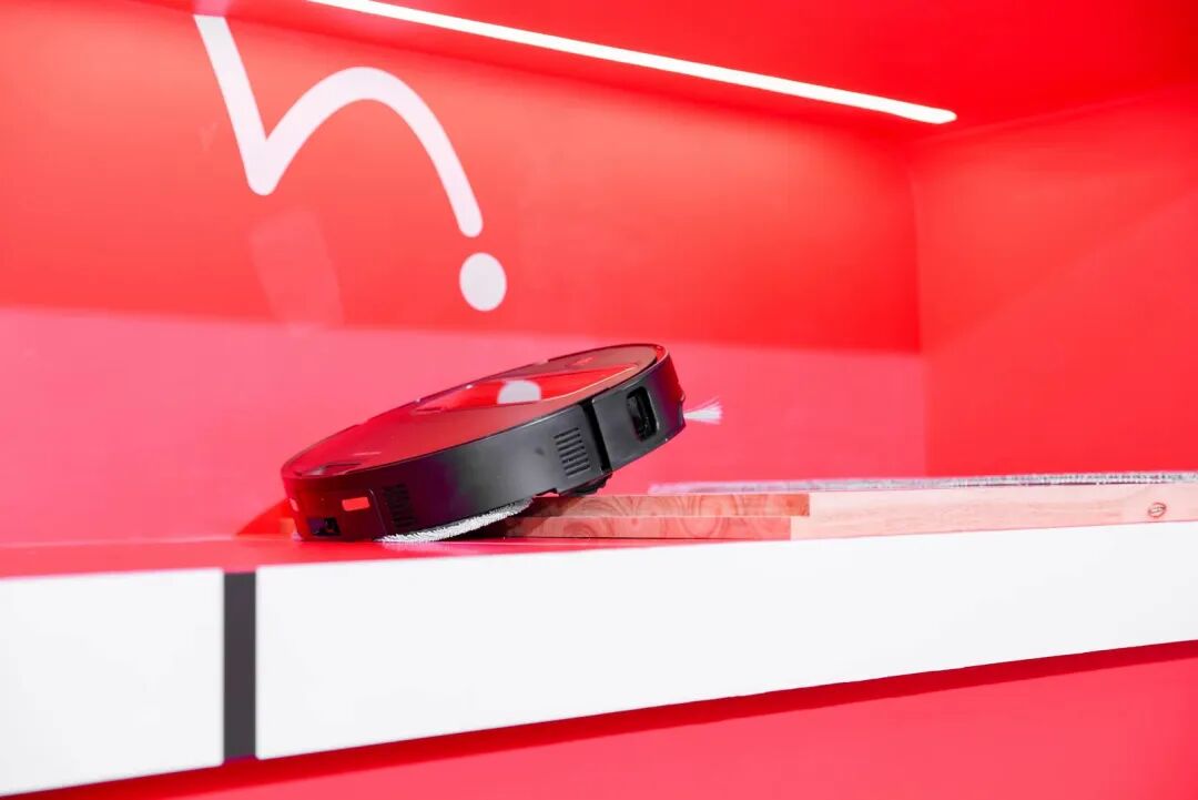 在上海新国际博览中心的一处展台上,一台扫地机器人正缓慢地向前移动。在它面前,是一段模拟楼梯。机器人停顿了一秒,轮腿伸长,机身抬起,随后跨过了台阶。
