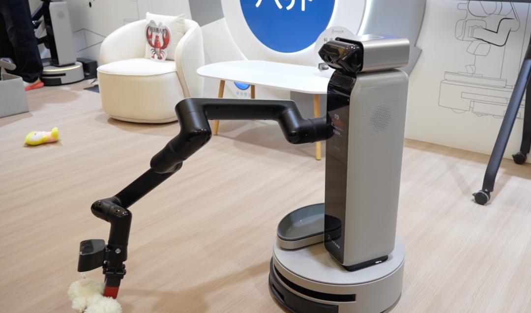 几米之外,一台扫地机器人伸出机械臂,把地上的拖鞋捡起来放到一旁,然后继续开始清扫。