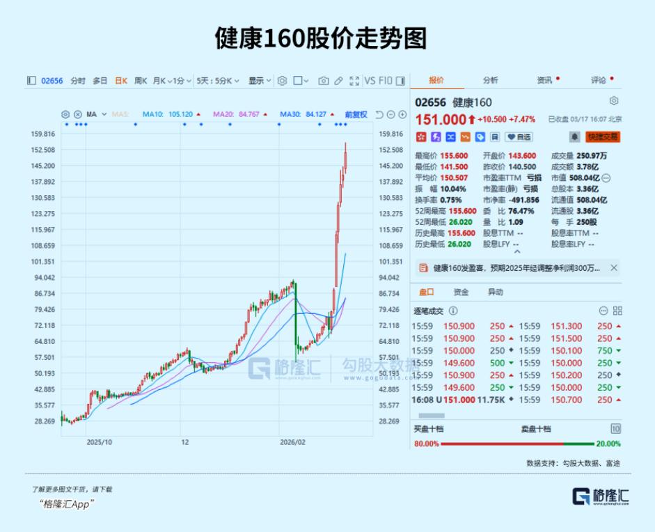 在此浪潮下,近日健康160股价连续7天暴涨,股价直接翻倍。更让人震惊的是,该公司当前股价151.0港元,自2025年9月上市以来(发行价11.89港元/股),仅半年时间就飙升高达11.7倍!