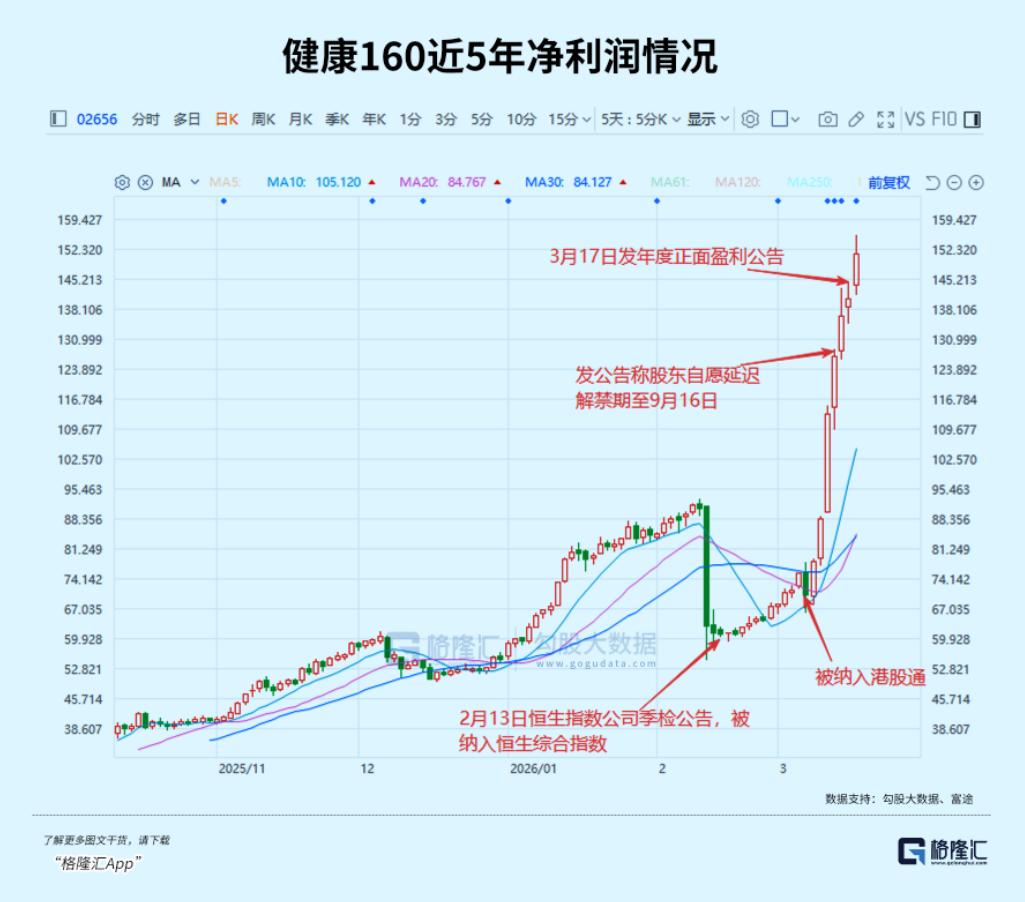 值得一提的是,2026年2月13日,恒生指数公司公布季度检讨结果,健康160被纳入恒生综合指数,然后次日起,该公司股价止跌回涨,并随着3月6日沪深交易所正式发布港股通标的调整公告,其股价开启非常强势的连续大涨行情。