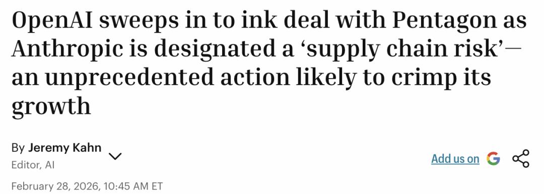 在这一轮绝地反击中,OpenAI还意外迎来了一个「外部利好」,Anthropic被五角大楼认定为「供应链风险」。