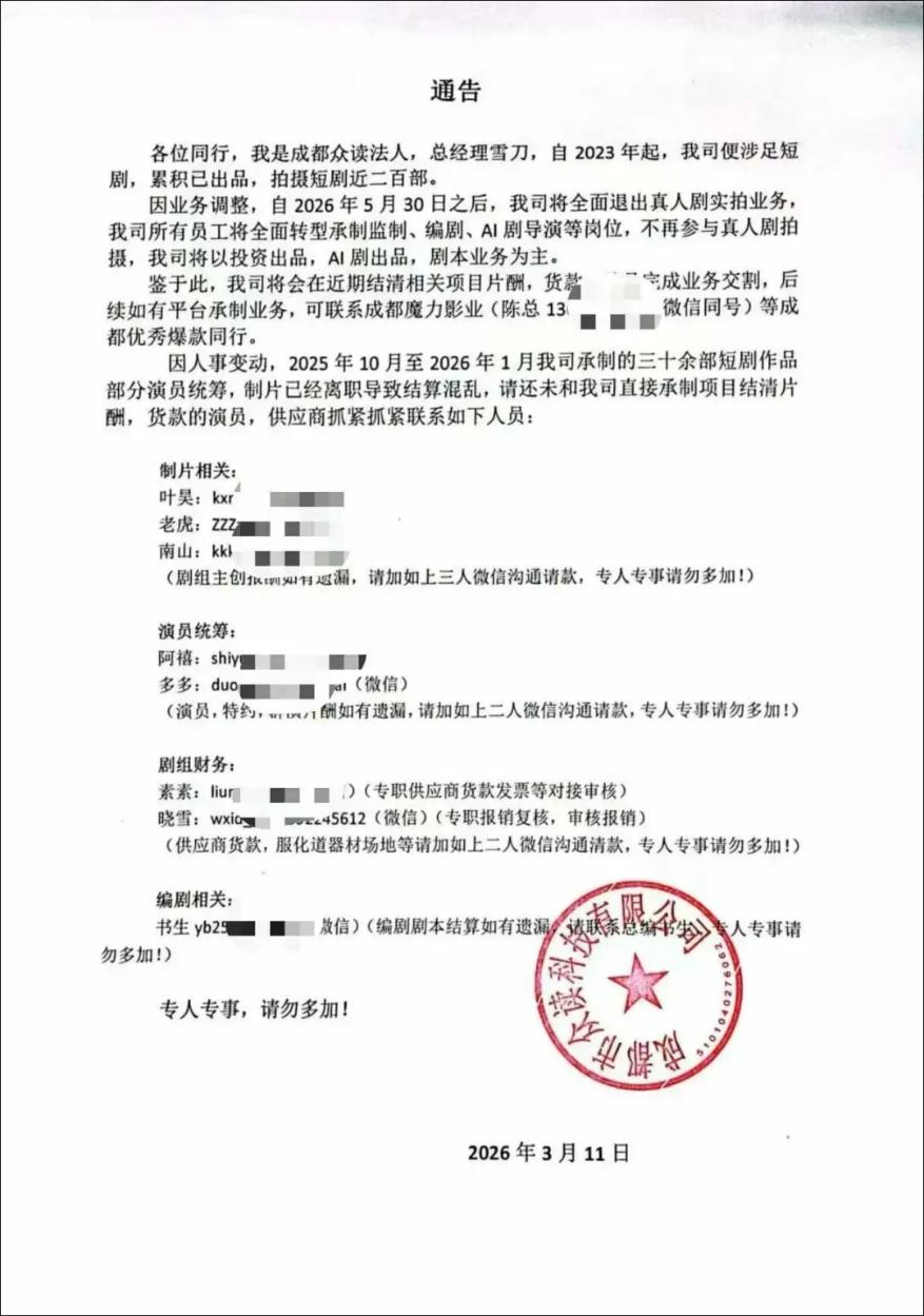 3月12日,短剧承制方成都众读发布通告称,自2026年5月30日起,成都众读将全面退出真人剧实拍业务,所有员工将全面转向承制兼制、编剧、AI剧导演等岗位,不再参与真人剧拍摄,公司后续业务将以投资出品AI剧及剧本为主。