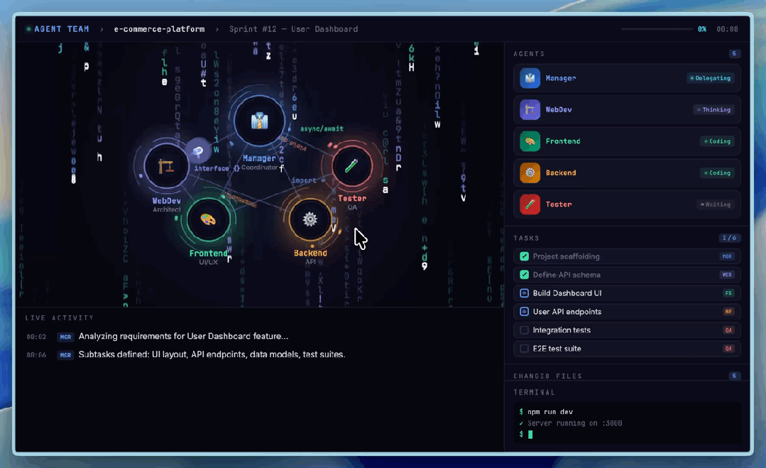 Agent Teams 场景下,模型需要稳定锚定角色身份、主动挑战队友的逻辑与伦理盲区、在复杂状态机中自主决策。下面是我们内部使用的一个做产品原型开发的 Agent Teams,里面包含了做产品原型的一个最小组织。
