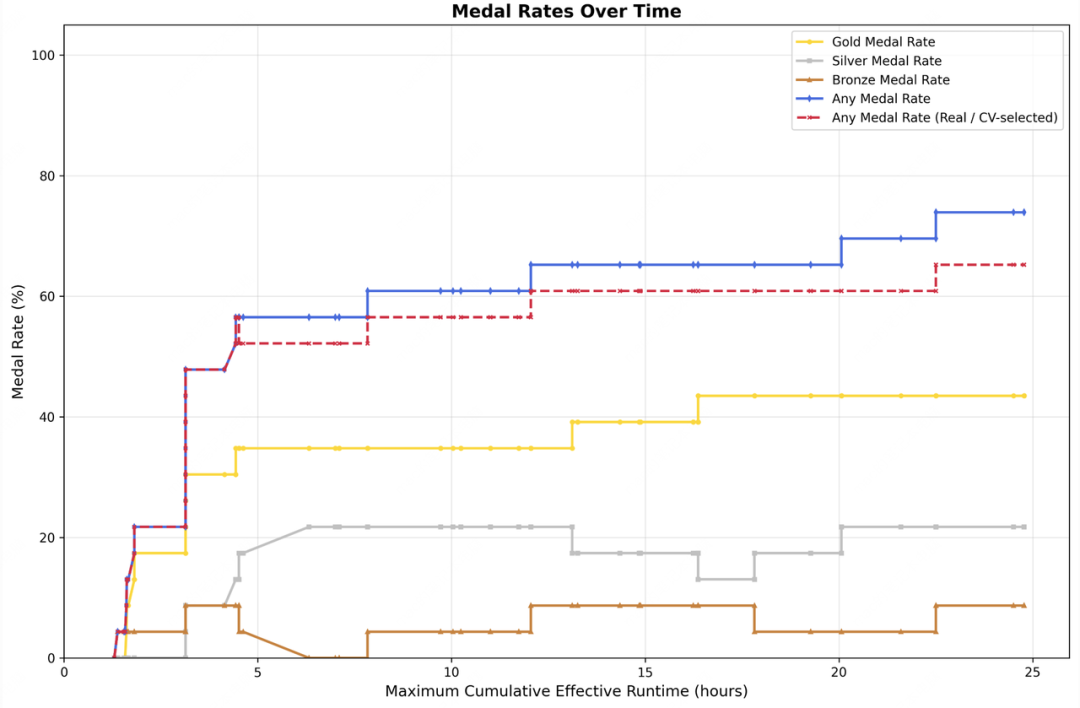 我们总共测试三次,每次有 24 小时来迭代进化,从下图中能够看到 M2.7 随时间不断取得更高的性能。最好的一次取得 9 枚金牌,5 枚银牌,1 枚铜牌。三次平均是 66.6% 的得牌率,此成绩仅次于 Opus-4.6 (75.7%)、GPT-5.4 (71.2%),和 Gemini-3.1 (66.6%) 持平。