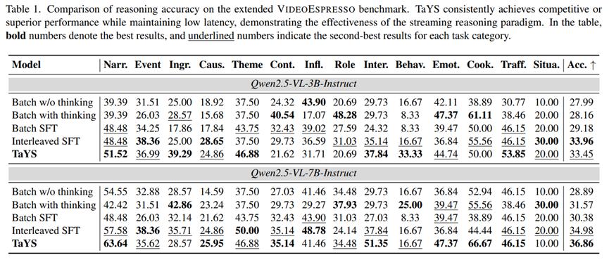 准确性:在事件动态、因果推断、主题理解等视频思维链任务上,整体优于批处理基线与朴素交错流式基线。