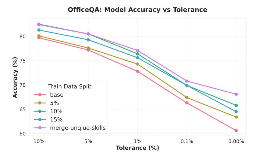 图 | EvoSkill 在 OfficeQA 基准测试中,不同训练分割和容差水平下的表现。