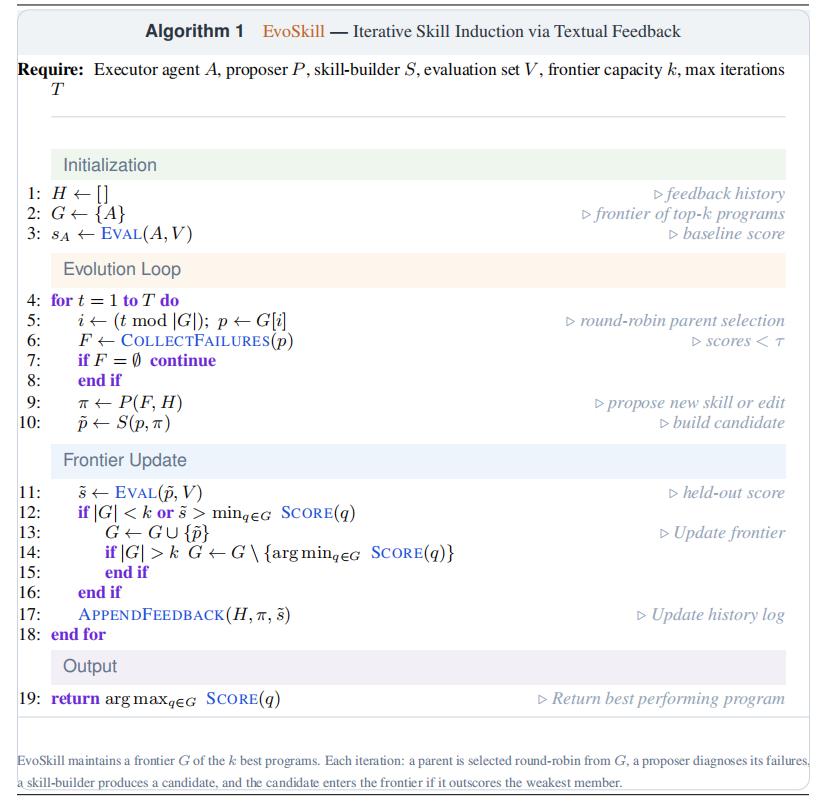 图 | EvoSkill——基于文本反馈的迭代 Skills 归纳。