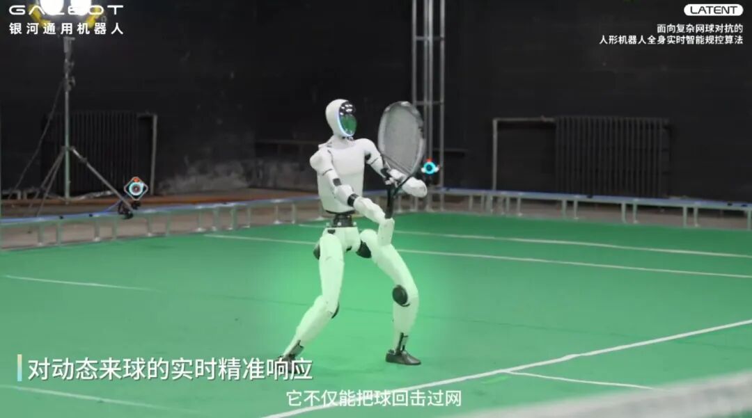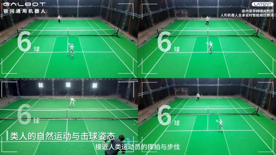在时速10公里的高动态网球博弈中,一白色人形机器人在毫秒级时间内完成判断、调整和响应,以接近人类运动员的挥拍与步伐,在长达数分钟的多回合对拉中连接6球……