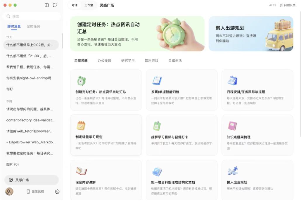 【skills能力】完全兼容OpenClaw技能包,应用里的「灵感广场」也内置很多技能可以用。
