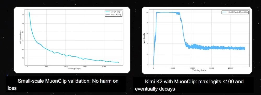 ▲MuonClip将max logits控制在100以内,实现稳定训练