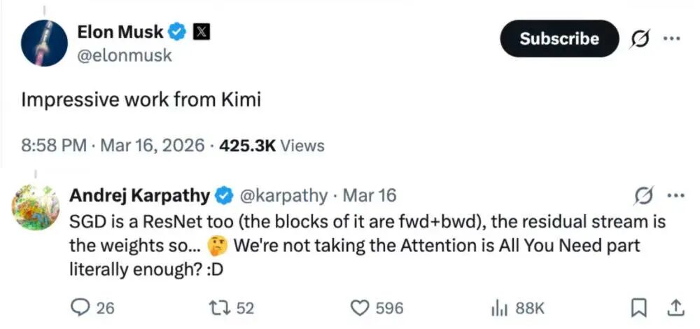 这项进展很快引发海外AI圈关注。埃隆·马斯克(Elon Musk)称其“令人印象深刻”;前OpenAI研究副总裁、联合创始人安德烈·卡帕西(Andrej Karpathy)则直言,人们对《Attention is All You Need》这篇Transformer开山之作的理解,可能还不够充分。