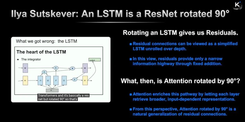 ▲Ilya提出“将LSTM旋转90度得到残差连接”,Attention可视为其扩展