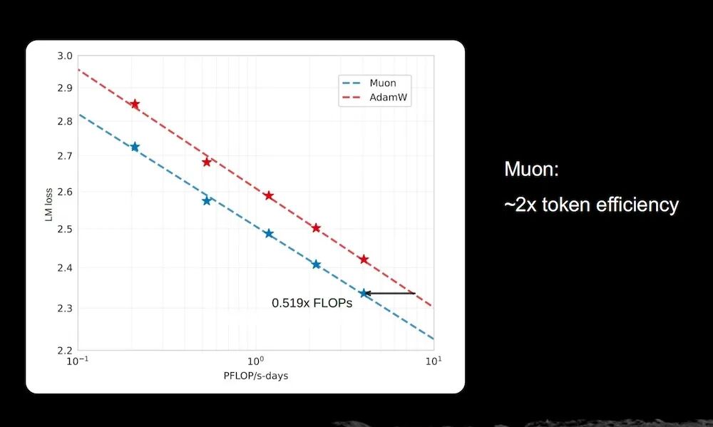 ▲Muon优化器在相同算力下实现约2倍Token效率
