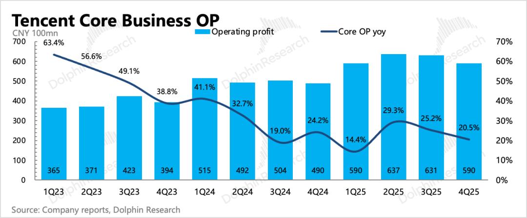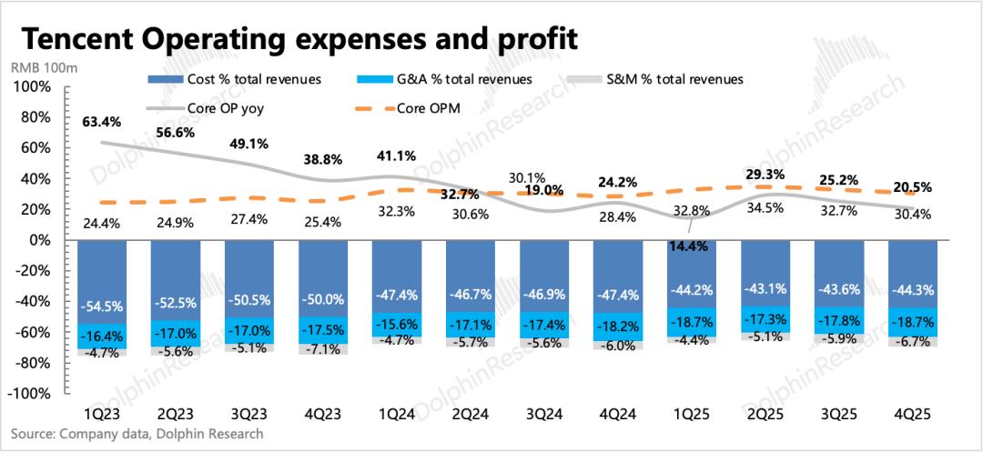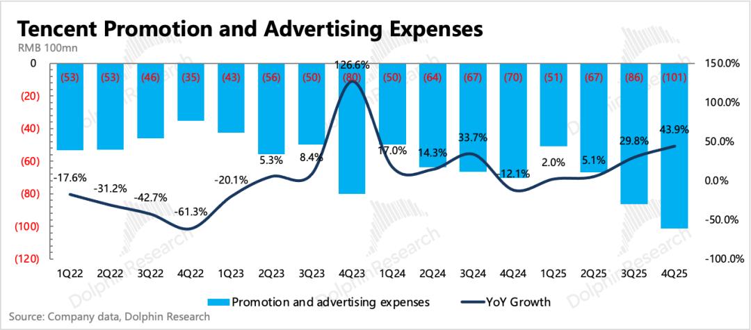 4. 成本优化,费用增加:最终利润率提升趋势不变,经营利润率同比提高2pct。但当季在元宝等AI产品上的宣发开支体现得比较明显,单看推广费用同比增长44%,环比多花了15亿。除了少量新游戏宣发外,应该就是主要用于元宝买量了,显然Q1销售费用只会更高。