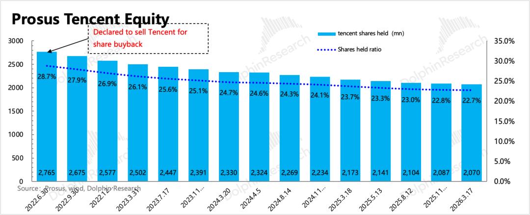 从上次财报披露至今的4个月,腾讯总股数净减少3900万股。但同期大股东减持力度仍然与上季度持平,相比以往力度放缓。月均抛售量继续下降,总抛售1600万股。截至昨日,Prosus在腾讯中的股权占比降至22.74%,环比上季度财报发布日减少0.08pct。