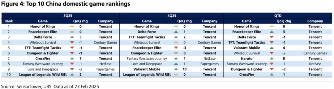 因为四季度无重要游戏新上线,因此本土市场的增量还是主要靠次新游戏《三角洲行动》、《无畏契约》系列,以及长青游戏《和平精英》等;海外则还是依赖Supercell和《PUBG MOBILE》的表现。
