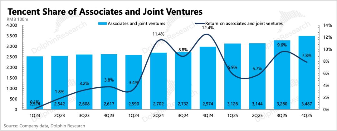 截至四季度末,公司联合/合营资产规模合计3487亿,计算得腾讯的投资收益率为7.8%(年化),环比三季度季度有所下降。